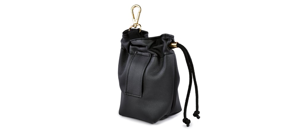 dem schwarzen und robusten Kunstleder, aus. Innen ist wasserabweisender Outdoorstoff verarbeitet, so dass eventuelle Feuchtigkeit von eingefüllten Leckerlies nicht nach außen