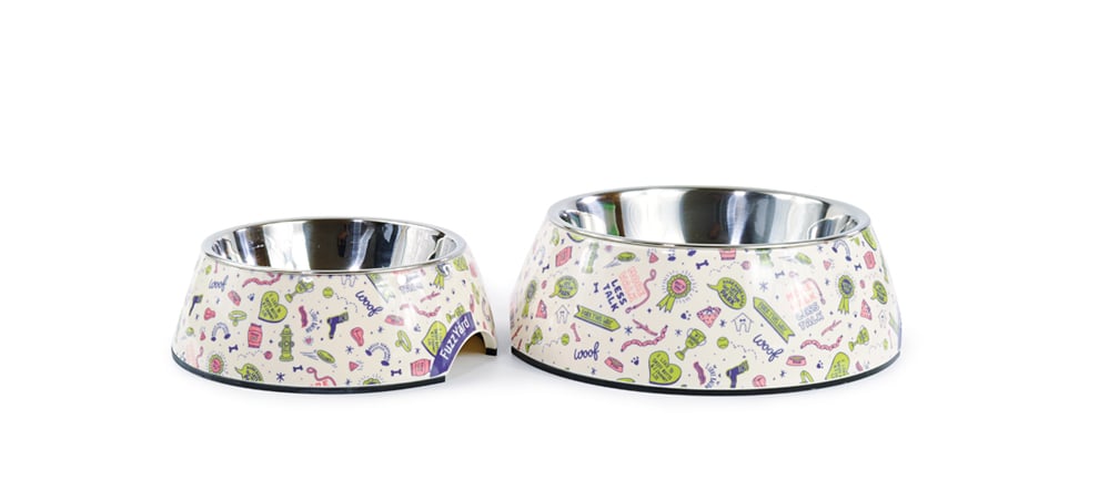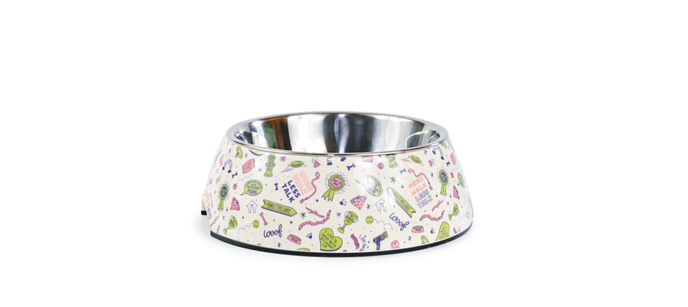 Neben seinem außergewöhnlichem Design, verfügt er über einen herausnehmbaren Edelstahleinsatz. Die robusten Gummifüße verhindern ein Verrutschen, während Dein Hund sein Essen genießt. Die Außenschale besteht aus buntem Melamin, ist leicht zu reinigen und 100% frei von Weichmachern.