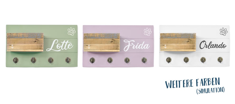 Du möchtest außer dem Namen Deines Hundes noch weiteren Text auf der Garderobe? Schreib uns eine Mail an design@hundestrand-shop.de und wir überlegen uns wie wir Deinen Wunsch umsetzen.