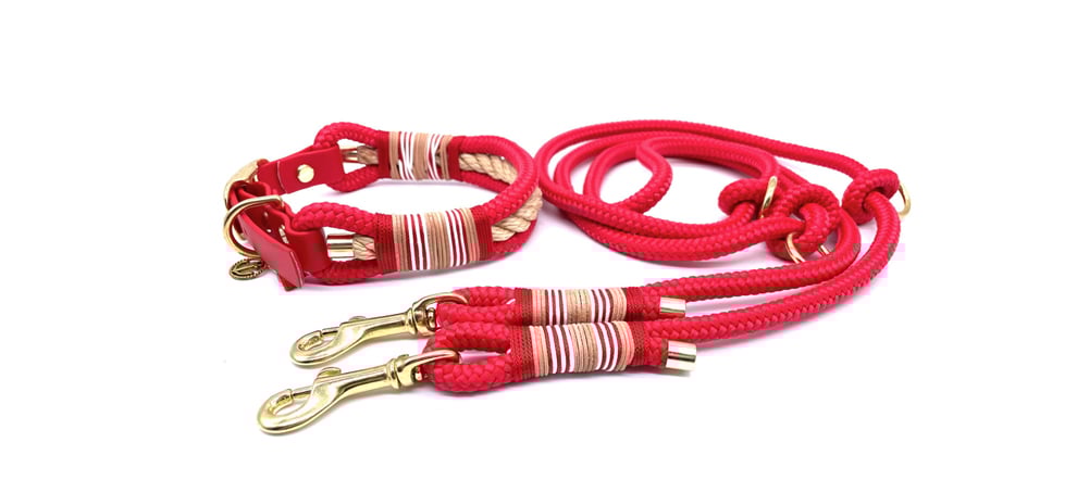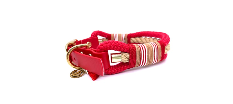 übertragenem Sinne sehr viele Aspekte, wofür hundestrand steht. Ein knalliges Rot, kombiniert mit geschickt eingearbeitetem, naturfarbenem Tau im Halsband. Dazu wunderschöne goldene Karabiner und