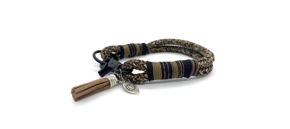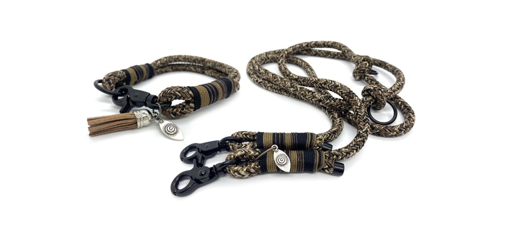 „Wildlife“ geht auf einen Mix zwischen Native und Maritim. Accessoires, Takelage und schwarze Karabiner sind harmonisch auf einander abgestimmt und bilden mit dem gemusterten Tau ein einmaliges Erscheinungsbild. Durch die gedämpfte Farbgebung kann, unserer Meinung nach, jeder Hund, wie Besitzer, mit diesem Set einen dezenten und modischen Akzent setzen. Eventuell einfach mal kurz inne halten und bildlich vorstellen? :)