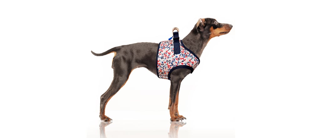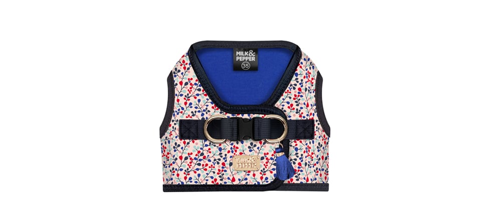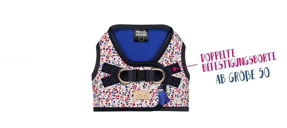 Das Hundegeschirr „Manon“ steht mit seinem Design für sich und verbindet wunderschöne Optik mit Nutzen. Farbig abgestimmte florale Motive auf rosa Hintergrund. Passend und kontrastreich dazu, ein tiefblaues Innenfutter und goldene Ringen, als Verbindung zur Deiner Leine.