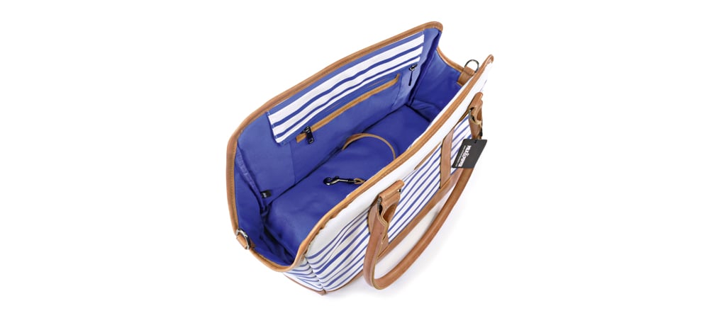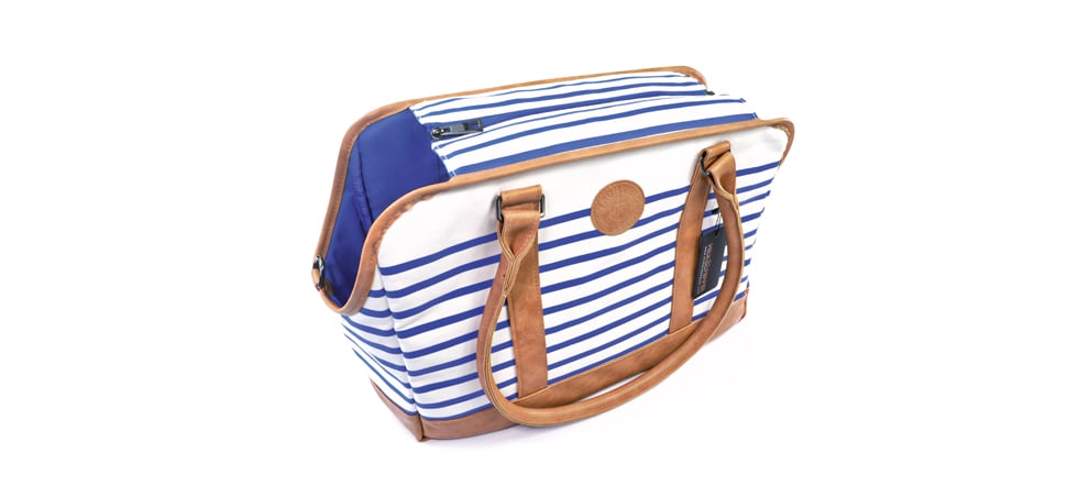 Die Hundetasche „Zaig“, für Hunde bis 8 kg, kommt aus der Yachting-Collection von Milk&Pepper und spiegelt zu 100% Meeresfeeling wider. Ob am Strand oder auf einer Segelbootstour, mit einem anschließenden Glas Sekt oder Wein, Du wirst modisch glänzen. Der äußere blau-weiß Kontrast harmoniert optisch perfekt mit dem hellbraunen Kunstleder und lässt fast den praktischen Nutzen vergessen, den diese Tasche vorzuweisen hat.