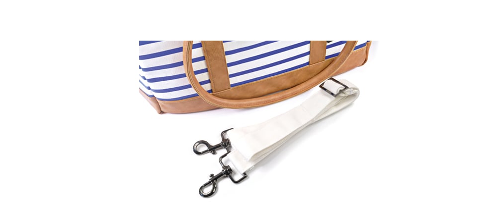 Zusätzlich hat diese wasserabweisende Hundetasche 4 kleine Standfüße aus Metall, sowie einen verstellbaren weißen Tragegurt, welchen Du mit Karabinern an der Tasche befestigen kannst.