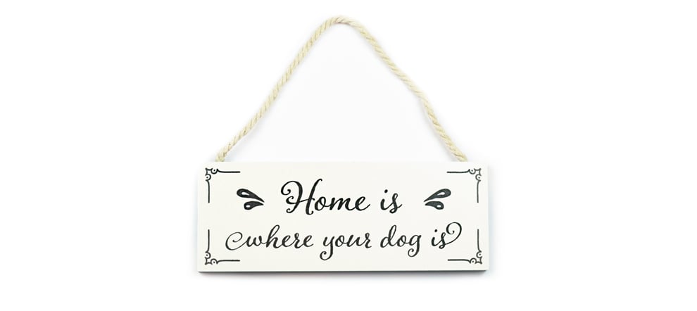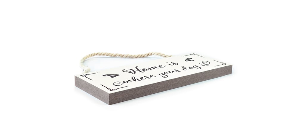 Das Holzschild „Home is where your dog is“ wurde cremeweiß lackiert und die Schrift im Direktdruck produziert. Somit gibt es keine Folie, oder ähnliches. Die Farbe ist direkt auf dem Material aufgebracht. Die Baumwollkordel sieht nicht nur wunderschön aus, mit ihr kann das Schild auch überall in der Wohnung aufgehangen werden. Da seine Dicke 1,6 cm beträgt, ist es ebenfalls möglich, die Holztafel frei in ein Regal zu stellen.