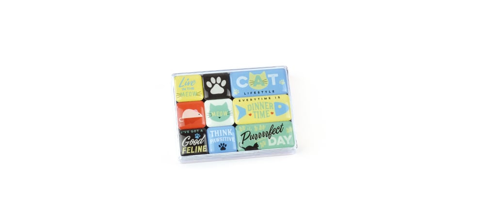Dann ist dieses bunte Retro-Magnet-Set mit süßen Katzenmotiven genau das Richtige für Dich. Die Oberseite der Magnete ist mit einer hochwertigen Beschichtung mit transparenter Wölbung (Doming) versehen. Dadurch sind diese angenehm greifbar.
