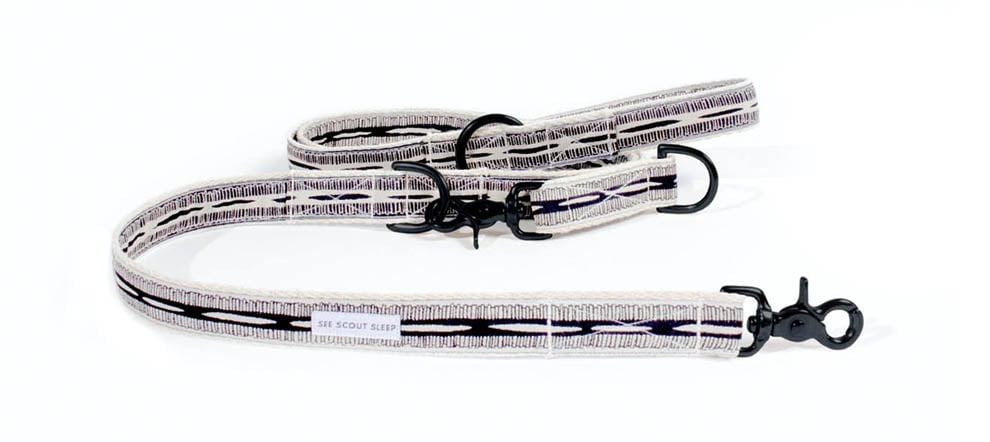 Handgefertigt besteht die Leine aus Hanfgewebe, Nylon-gemustertem Band aus Tennessee und schwarzer Messing-Hardware.